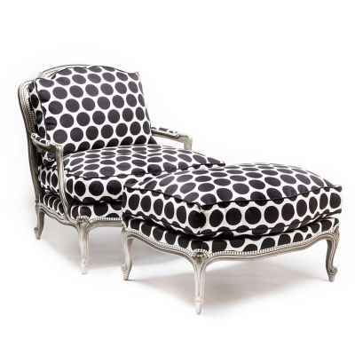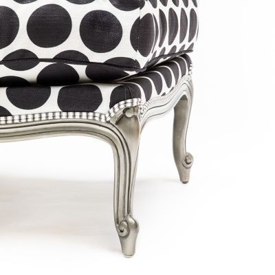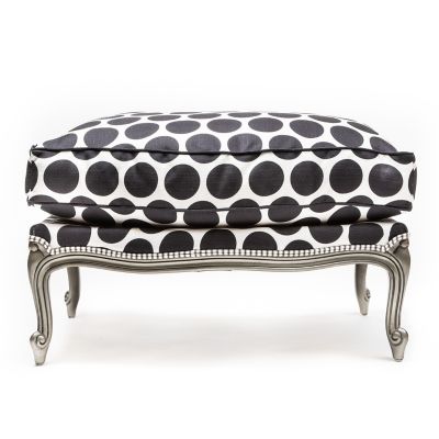Our Black Spot On Ottoman is just that—the perfect place to put your feet up, especially when paired with our Black Spot On Chair. Featuring bold black dots on a beechwood frame with hand-applied pewter finish, it’s trimmed with black and ticking fabric welts.
