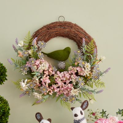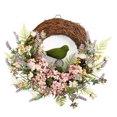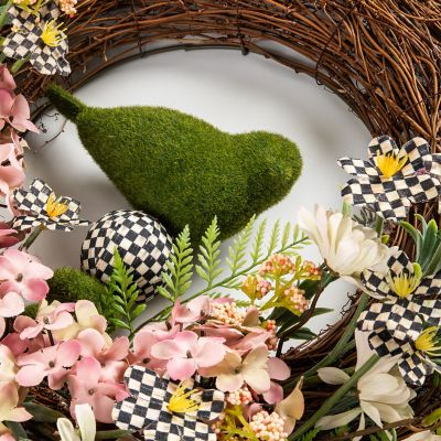 Welcome spring with this grapevine wreath embellished with everlasting spring and Courtly Check® florals and a moss-covered bird in the center.