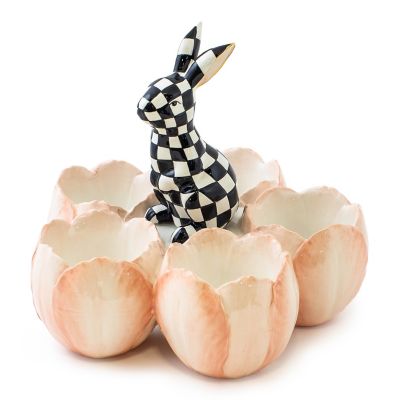 Spring ahead with this ceramic candy dish, featuring a hand-painted, check bunny set in the center of five tulip-shaped cups. It’s food safe, so you can add jelly beans or colored Easter eggs to each cup.