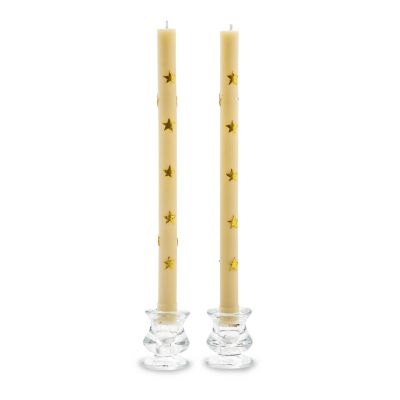 This set of two beeswax-blend dinner candles is absolutely enlightening on the holiday table, featuring gold star wax appliques.