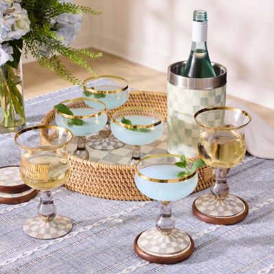 Give your home bar the stylish touch of MacKenzie-Childs. Made of stainless steel with an enamel coating of our color-dragged grey checks, the 3260 Sterling Check® Wine Cooler holds a bottle of your favorite vintage. Pair it with a set of our hand-painted wine glasses for a memorable gift or use it to hold a sunny bouquet of fresh flowers.
