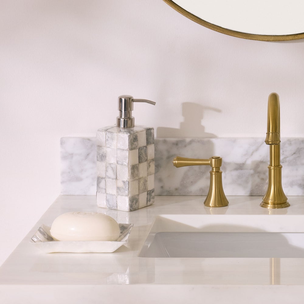 Bring our signature grey and white Sterling Check and plenty of texture to your bathing space with our Sterling Check Capiz Bath Collection.