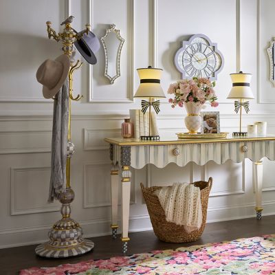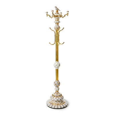 Sure to make a statement in your entry or mudroom, the Sterling Check® Coat Rack is pretty and practical. It’s completely handmade by our artisans in Aurora, New York, featuring three levels of hooks, hand-painted Sterling Check details, and 22K gold lustre accents, and is crowned with a ceramic bird on top.