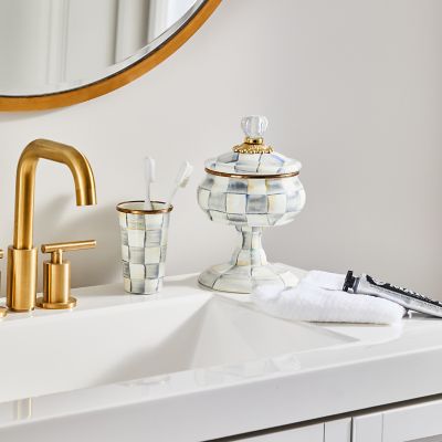For housing treasured trinkets, there’s no container more charming than our Sterling Check Enamel Curiosity Pot. A handsome curved pot with a perfectly matched pedestal is dressed in our signature grey checks and topped off with a lid featuring a brass bobeche and clear glass knob.