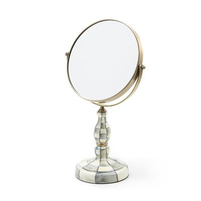 Here’s looking at you with the Sterling Check Enamel Vanity Mirror. Made of heavy-gauge steel and decorated with hand-painted Sterling Check, it flips from regular view to a 5× magnified view.