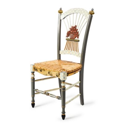 The Sterling Check® Flower Basket Side Chair elevates our classic Flower Basket Side Chair with hand-painted Sterling Check on a maple frame fitted with a woven rush seat. It’s also accented with marbling on the legs, toile decals over gold leaf on the apron, and brass and check finials. It’s crowned with an iron oxide-decorated flower basket detail on the seat back.