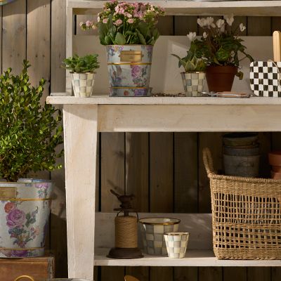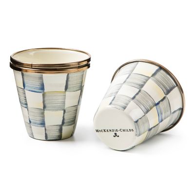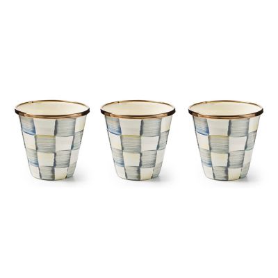 A trio of petite Sterling Check® Enamel Herb Pots—hand-painted with color-dragged checks—are just the right size for a miniature kitchen herb garden. Presented in a woven sinamay pouch tied with a black grosgrain bow, these make fun party favors, place card holders, or even sorbet dishes. The ideas are endless.