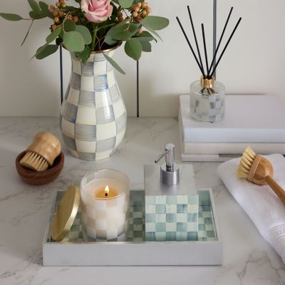 Dress up a household staple with the Sterling Check® Lacquer Soap Pump, featuring a silver leaf top with printed Sterling Check sides and finished with lacquer.