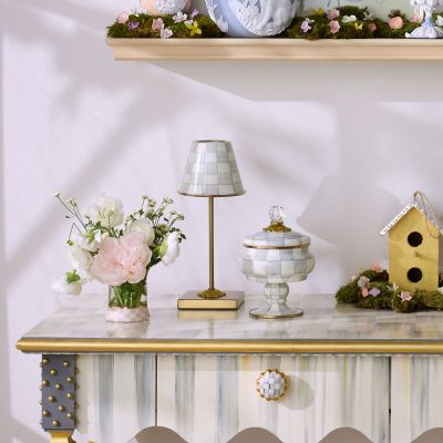 The Sterling Check® LED Rechargeable Cafe Table Lamp is the little light that shines big without the inconvenience of cords. Featuring our grey check pattern on a brass-finish base, it illuminates for up to three hours and recharges with a 5-watt USB cable (included). It operates with ease by tapping the shade on the top, and there are three settings for brightness.