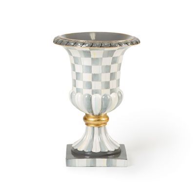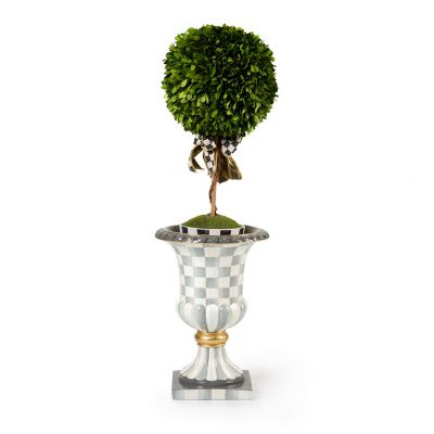 Elevate the presentation of our Sterling Check pattern with the Sterling Tabletop Pedestal Urn. Hand-painted with our signature grey and white patterns with golden embellishments, it’s just the right size for our topiary drop-ins.