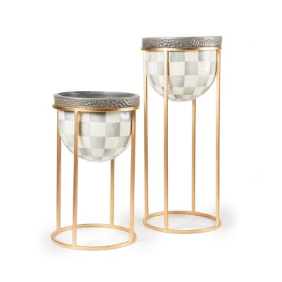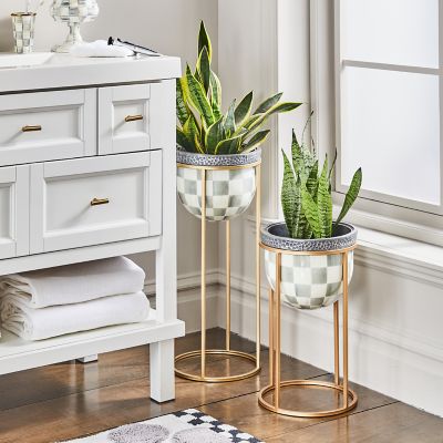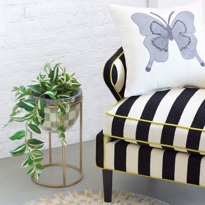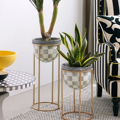 Display your plants with MacKenzie-Childs style in our Short Sterling Check Plant Stand. This two-piece set includes a hand-painted Sterling Check pot with a textured faux concrete edge that fits into an accompanying metal stand. Display in a protected location only.
