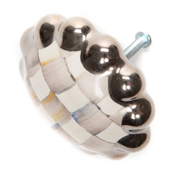 Hand-painted onto a scalloped silhouette of hand-glazed ceramic, the Sterling Check Round Knob features our color-dragged grey and white checks, framed in platinum lustre. Coordinate with our Sterling Check dinnerware for a kitchen marked by signature style or use as a drawer pull on an end table.