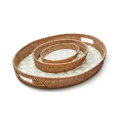 Materials | Heavy-gauge, hand-glazed steel tray base with hand-painted Sterling Checks, rimmed in woven rattan. Pieces may vary due to the handmade nature of each product. Imported. |