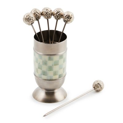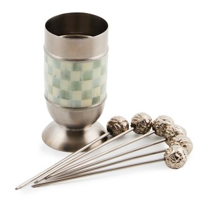 The Sterling Check® Supper Club Pick Set is the perfect serving utensil for charcuterie boards. This six-piece set of stainless-steel picks, with heads that resemble our signature cinnabar beads, stores in a stainless steel container accented with an enamel-coated band of Sterling Check.