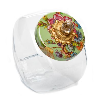 Our Sweets Jar with Green Flower Market Enamel Lid is small but mighty and just the right size for holding candies, soaps or office supplies. The half-gallon glass body offers a preview of the tasty goodness in store, and the lid—color-glazed and hand decorated with fanciful floral transfers—is topped with an elegant clear glass knob.