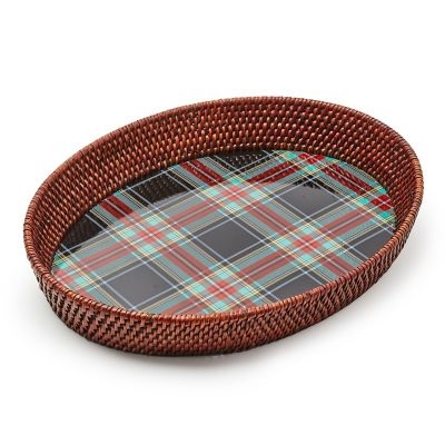 As handy as it is handsome, this large serving tray mixes an enameled black tartan base with woven natural rattan.