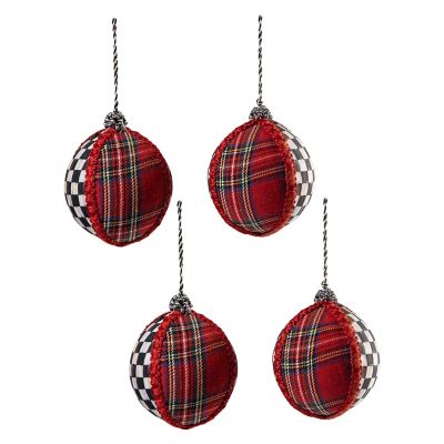 Make the tree merry and bright with this set of four ball-shaped, patchwork ornaments, mixing red tartan with Courtly Check®, and finished with red braided trim.