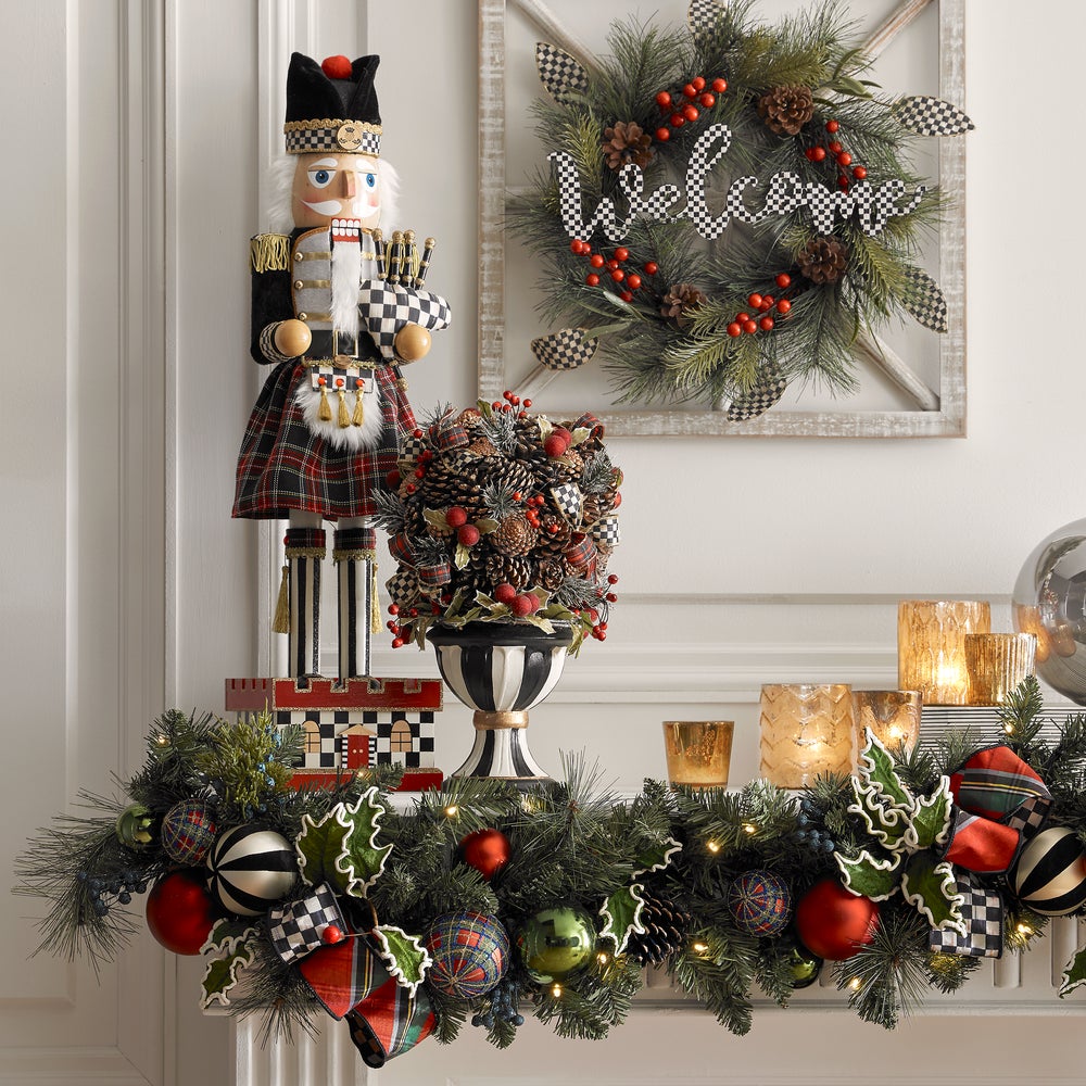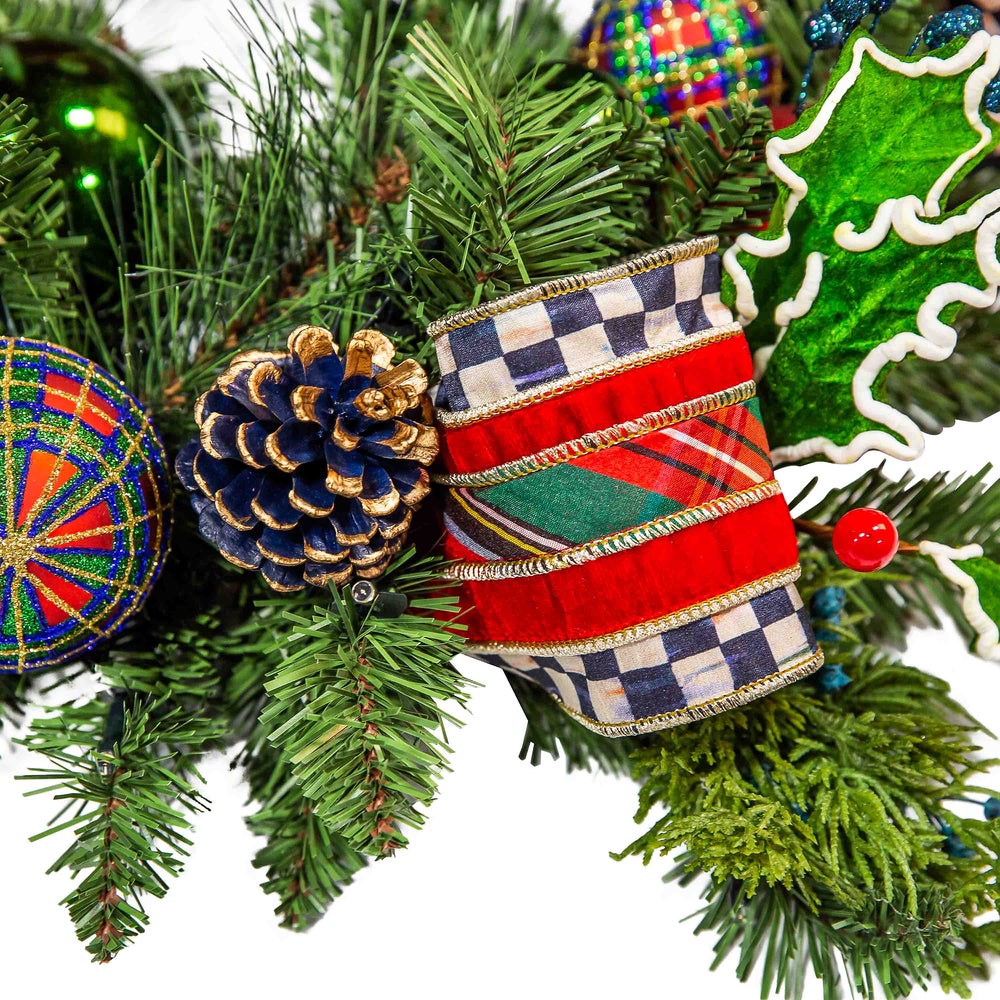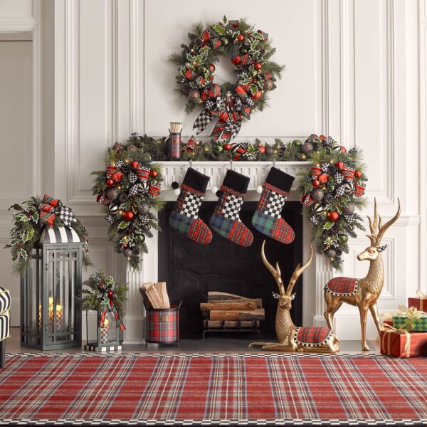 Deck the halls, the staircase or the mantel with this illuminated garland, featuring a base of everlasting pine and juniper greenery, accented with shatterproof ornaments, velvet holly leaves with berries, and trimmed with Courtly Check® and red tartan ribbon.