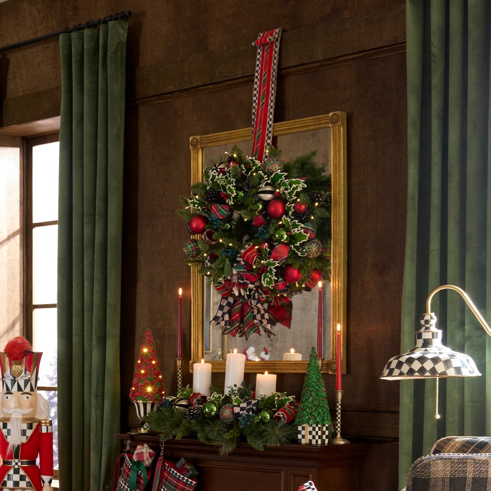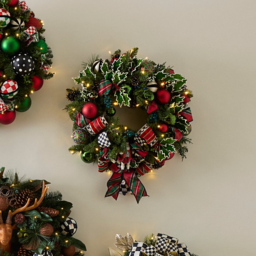 Deck the halls, the doors or above the mantel with this illuminated wreath, featuring a base of everlasting pine and juniper greenery, accented with shatterproof ornaments, velvet holly leaves with berries, and trimmed with Courtly Check® and red tartan ribbon. The finishing touch is a kilt-wearing Santa doll in the center.