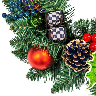 Deck all the small spaces with this mini wreath, made of everlasting pine and juniper greenery, accented with shatterproof ornaments, velvet holly leaves with berries, and finished with Courtly Check® and red tartan ribbon.