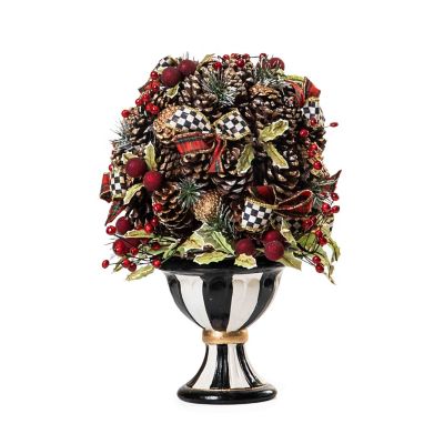 Deck the tabletop with this pinecone arrangement, made of gold-tipped pinecones, holly leaves with berries, and finished with Courtly Check® and red tartan ribbon. It’s set in a hand-painted Courtly Stripe drop.