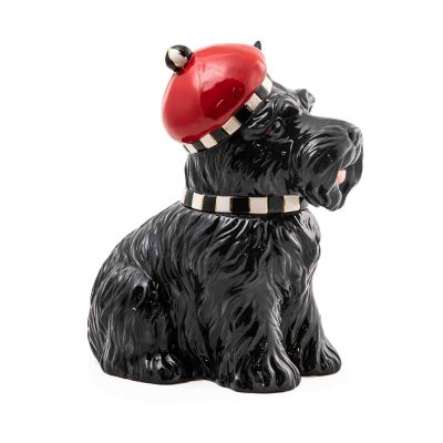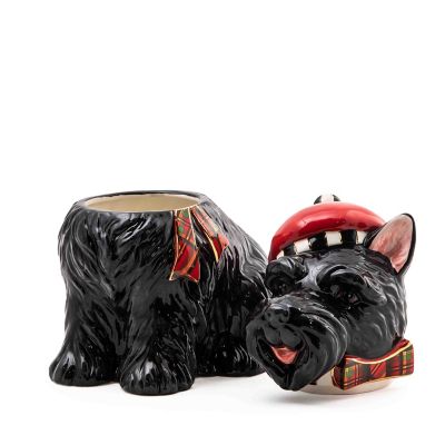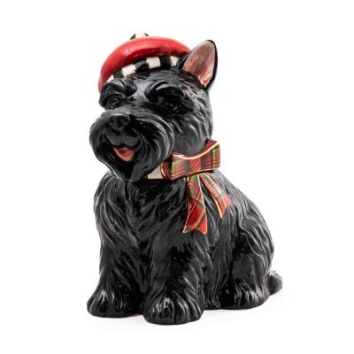 This ceramic Scottie biscuit jar is a delightful way to present Christmas cookies. The black Scottie dog wears a tartan tam, trimmed with a Courtly Check® button.