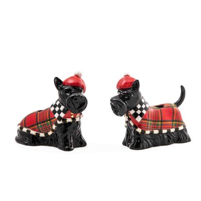 Make all holiday occasions illuminating with this set of two Scottie dog ceramic candle holders. Each black Scottie dog, decorated with a tartan coat, trimmed with gold lustre, holds one of our flicker dinner candles.