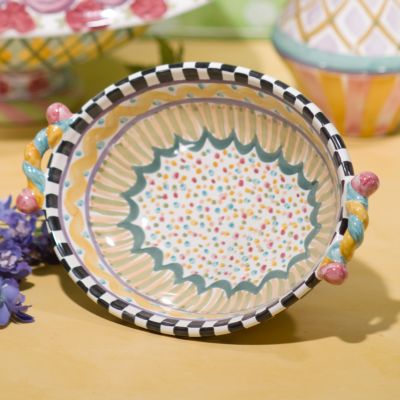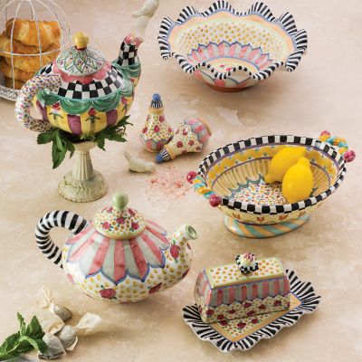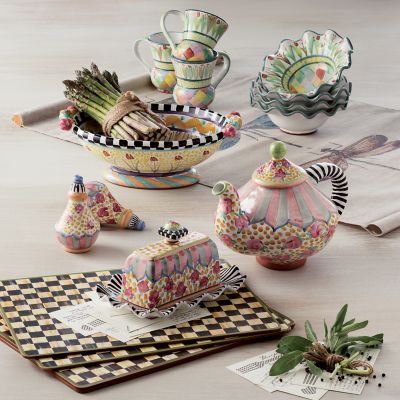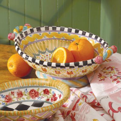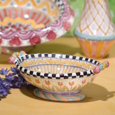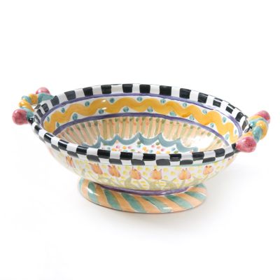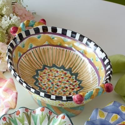 This fanciful design—with a basin of light, bright squiggles, spots, and stripes in lemon and sky hues—fits in easily with your favorite Taylor patterns and seems to work everywhere else too, making the Odd Fellows Large Footed Serving Dish the perfect “completer” to your Taylor ceramic tabletop servingware collection. Every inch of the handmade majolica body is hand-painted and handcrafted. Each one bears the stamps of the artisans who created it. Generously sized for side dishes and salads and as the star of the buffet table. Order a run of them to span the sideboard.