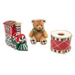 Set includes: 1 Train Candle Holder (5″ long, 2.5″ wide, 4.5″ tall), 1 Bear Candle Holder (3.75″ wide, 3″ deep, 4.5″ tall), 1 Drum Candle Holder (3.5″ dia., 2.75″ tall)