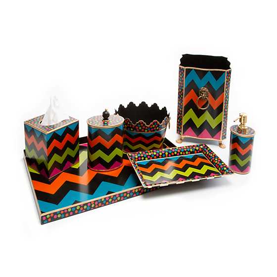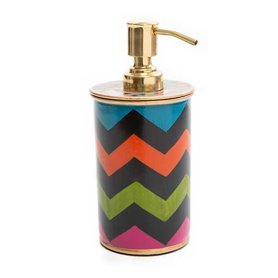 Add serious style to your powder room. The Black Trampoline Pump Dispenser features colorful chevrons, accented with gold-tone edging. Group the whole Black Trampoline bath collection together for a standout washroom setup.