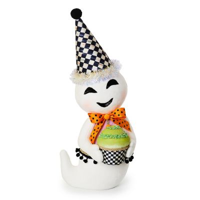 Celebrate the sweetness of Halloween trick-or-treating with this molded ghost figurine featuring a cupcake that’s covered with plush fabric and accented with Courtly Check® trims.