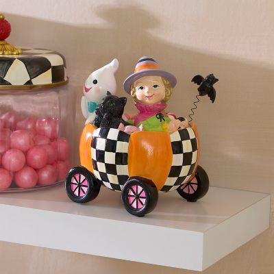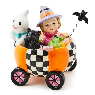 Good things come in threes–like this figurine, featuring a witch, cat, and friendly ghost in a pumpkin cart that’s trimmed with Courtly Check®.