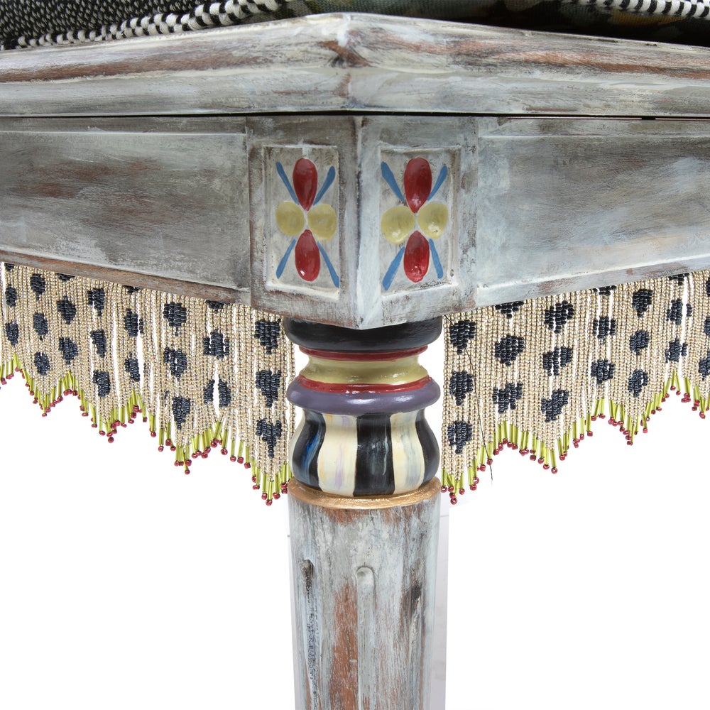 You might say our Triplicity Bench is a triple threat. It features three different chair back styles—caned, ladderback with our fish cutouts, and webbed—so there’s something to suit every style maker. The loose cushion is trimmed with checked cording and reverses from checks to florals. Underneath the cushion is a slatted wood surface that has the same whitewash finish as the chair backs. We like it as a banquette bench or in the entry, where it’s sure to strike up a conversation.