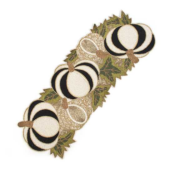 The Tuxedo Pumpkin Table Runner is a gathering of the most gorgeous ivory and black striped gourds and autumn leaves, entirely embellished with a harvest of beads, plus accents of mother-of-pearl. Place it down the center of a table or on a sideboard as the first layer of a showstopping display to welcome autumn.