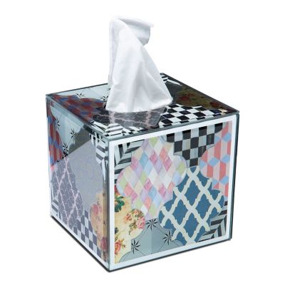 Handle every sneeze and sniffle in style! Our Venezia Boutique Tissue Box Cover dresses up an ordinary box of tissues, featuring a patchwork of iridescent patterns printed on mirrored glass, finished with beveled edges. Add our matching Venezia Soap Dispenser and Venezia Waste Bin to make the powder room pretty.