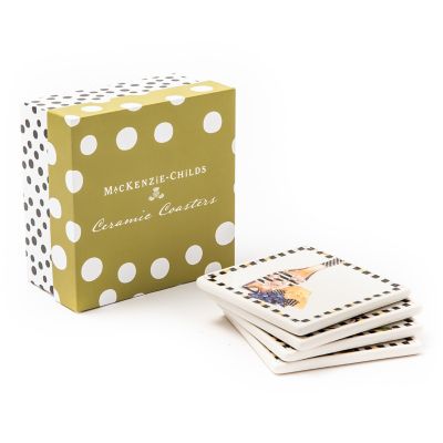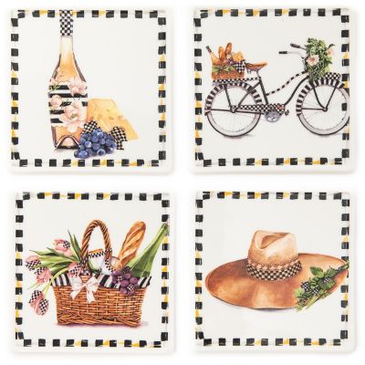 Keep surfaces clean and protected with our fun set of four Vino Alfresco Coasters, featuring four different alfresco picnic scene prints hand-applied to a ceramic surface, trimmed with checked borders and backed with natural cork. Beautifully boxed, they make a charming gift.