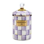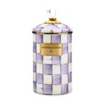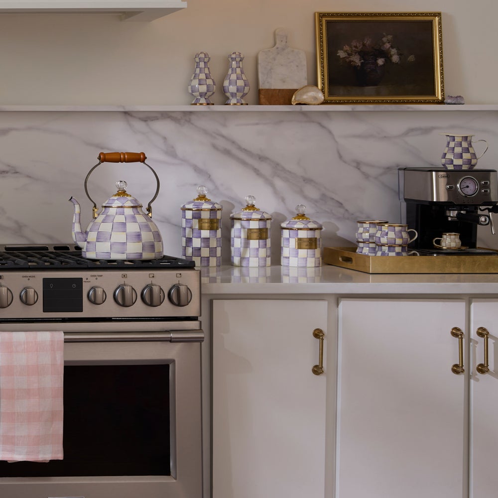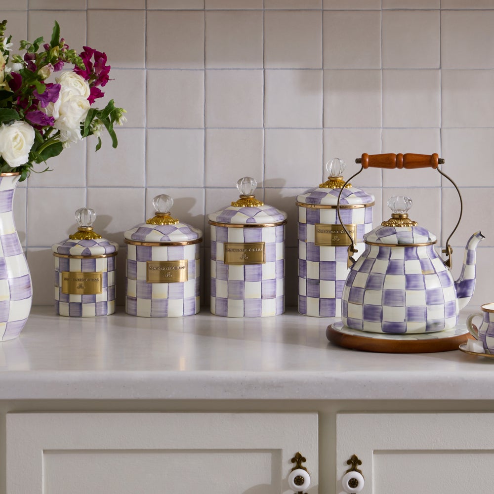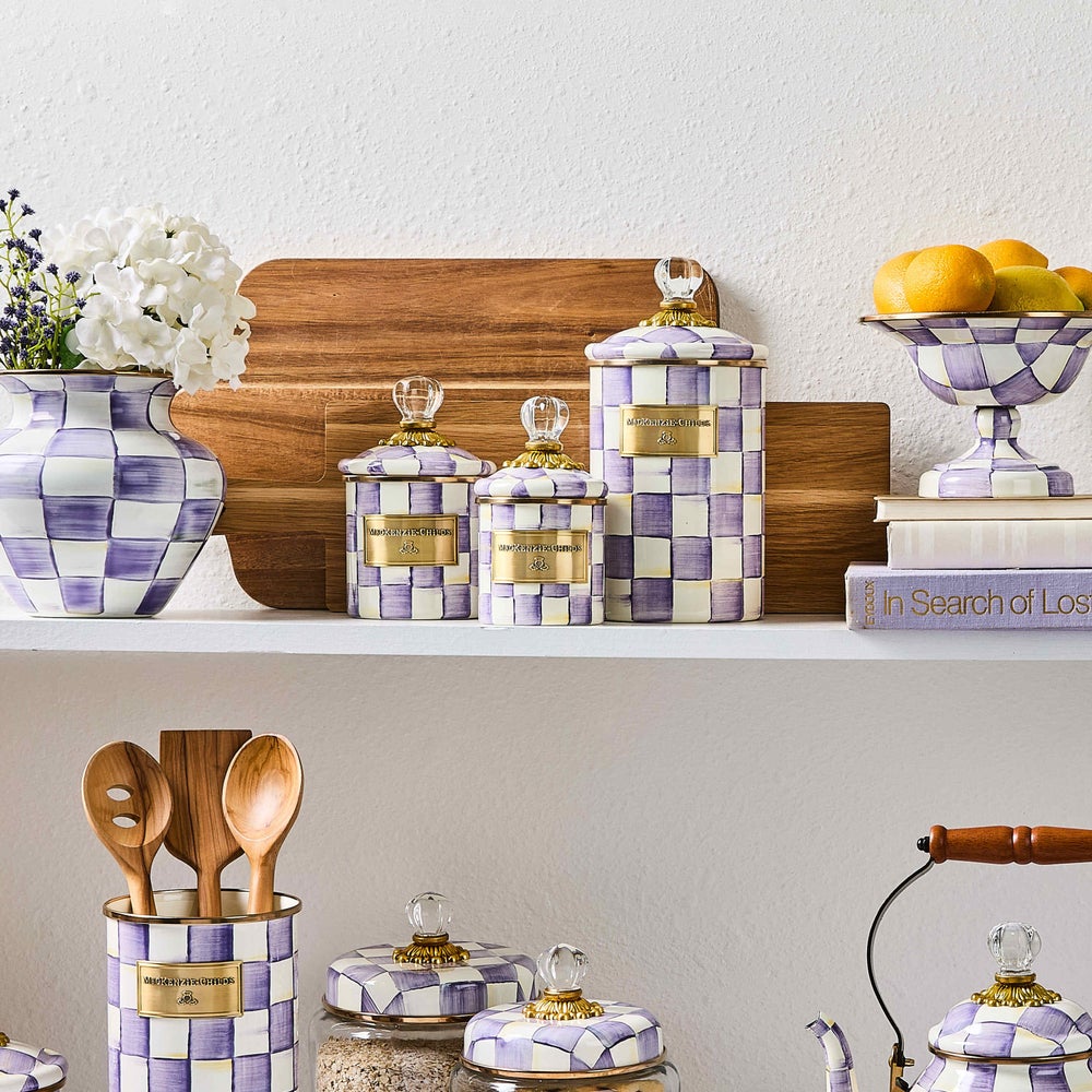 Pantry staples—flour, sugar, and coffee—might seem the most obvious choices with which to fill a Violet Check Canister, but the possibilities are endless! Each enameled steel canister is hand-painted with purple checks and topped with an elegant clear glass knob.
