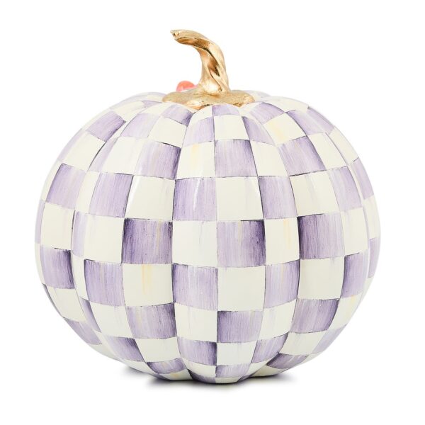 Take your pick from our truly unique pumpkin patch with the Violet Check Cascade Floral Pumpkin. Decorated in our signature violet checks and adorned by a golden fall floral garland, this decorative gourd is sure to be a favorite in any autumnal display.
