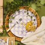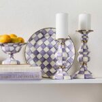 Set a place at the table for our Violet Check Dinnerware. Features purple checks hand-painted and rimmed in bronzed stainless steel.