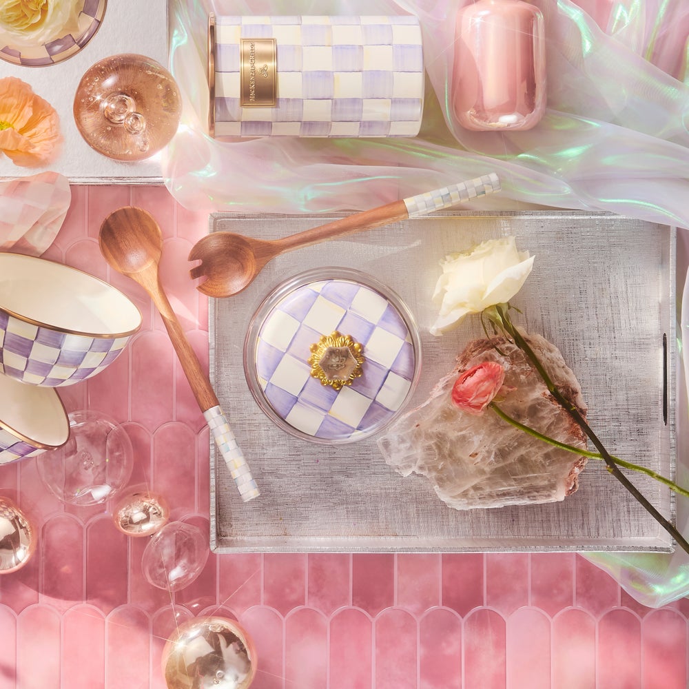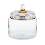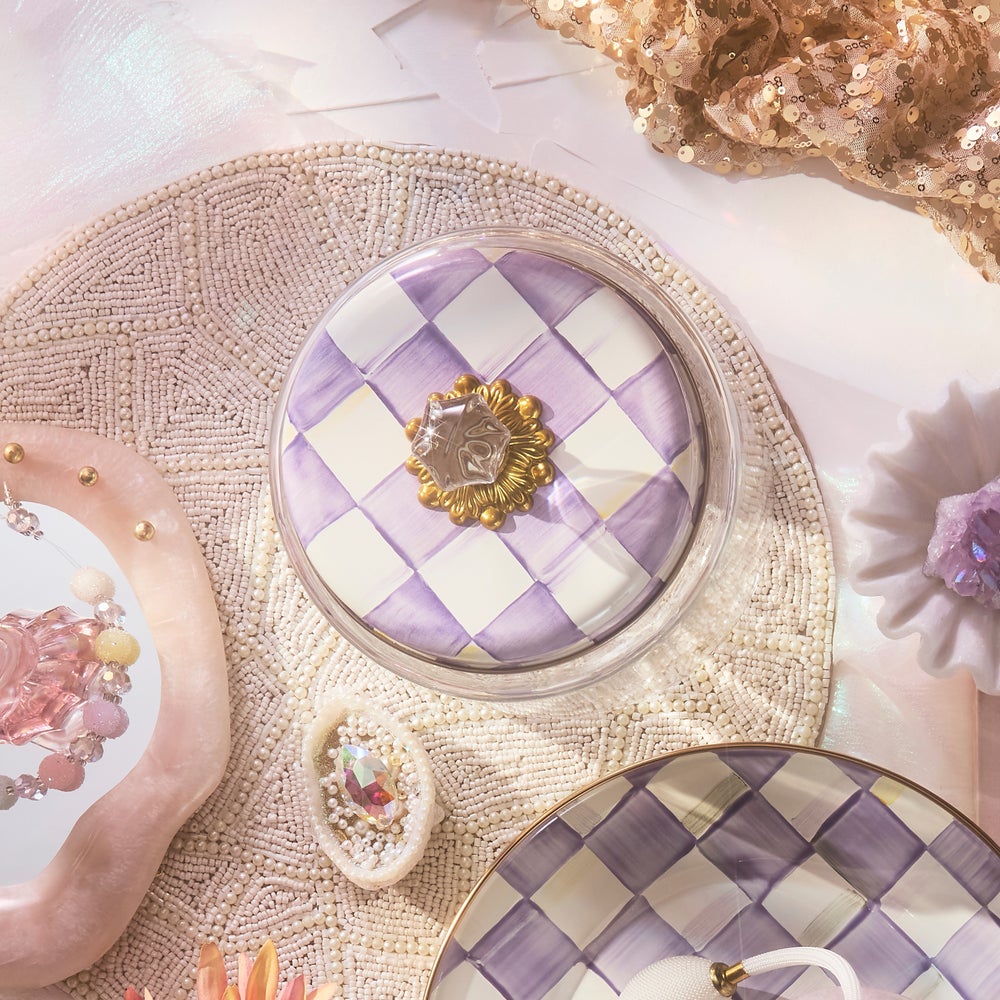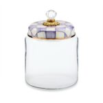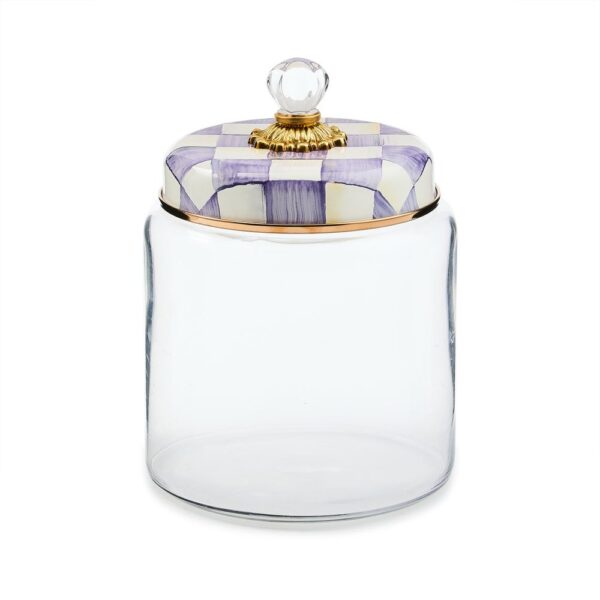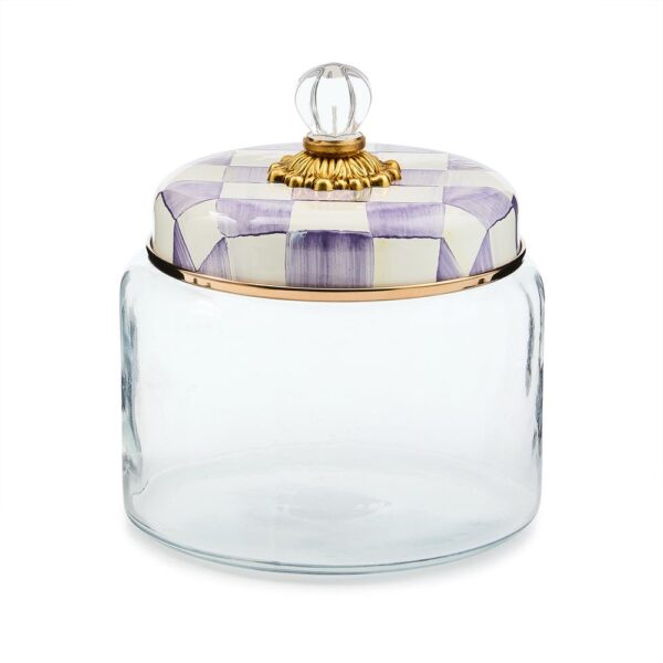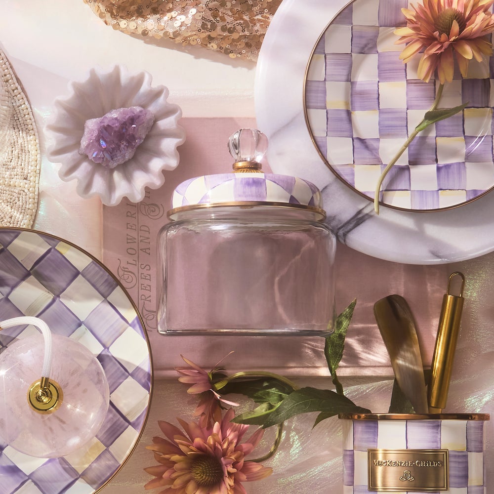 Keep countertops tidy in MacKenzie-Childs style with the Violet Check Kitchen Canister. With our color-dragged check pattern in a range of purple hues on the hand-painted enamel lid, topped with an elegant glass knob, who could blame you for wanting to overhaul the whole pantry? Collect all the convenient sizes to hold countless contents.