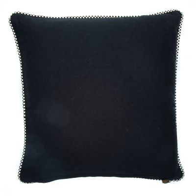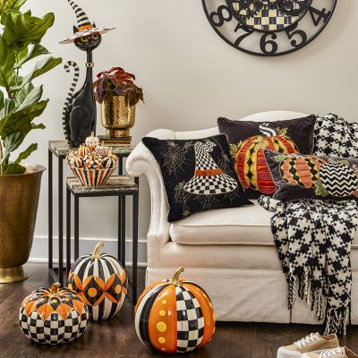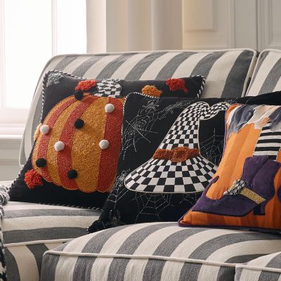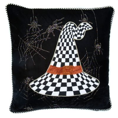 Tip your hat to the Which Witches Hat Pillow. A checked witch hat is embellished with beads on a black cotton velvet front that’s accented with beaded black spiders. The finishing touch is black and white checked piping.