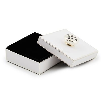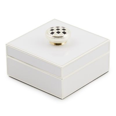 Store your keepsakes in this trinket box, featuring an enameled white coating on silver plate, lined with velvet and topped with a check knob. It’s presented in a box for easy gift giving.