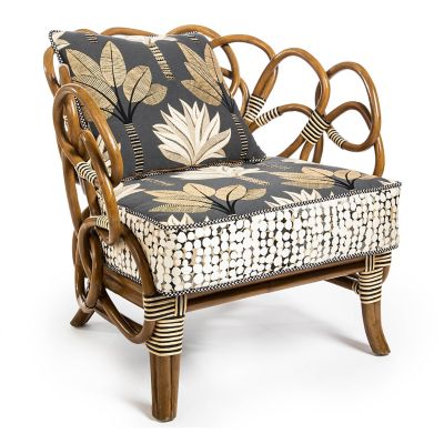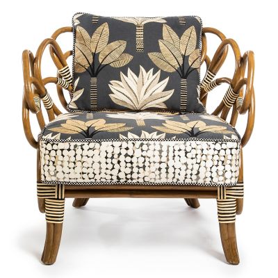 Bring the great outdoors in with this sculpted rattan chair, featuring a unique hand-torched frame accented with black and white bindings. It’s fitted with loose back and seat cushions, upholstered with a woven palm pattern, and paired with irregular dots on the boxing, trimmed with our check cording.