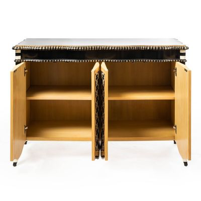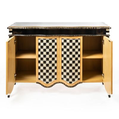 Make a statement in any room with this stylish wood sideboard that’s hand-painted and trimmed by our artisans in Aurora, New York. Side-by-side doors, accented with our Courtly Rattan Wallpaper, open to reveal one adjustable shelf inside. More stripes in gold and black trim the cabinet’s scalloped edge and tabletop.