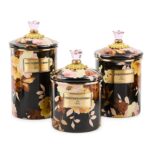 Pantry staples, flour, sugar, and coffee might seem the most obvious choices with which to fill a Wild Rose Brown Canisters, but the possibilities are endless! Keep it in the kitchen with coffee beans and tea bags, cookies and candies, or dog biscuits and birdseed, or invent new uses around the house. Each enameled steel canister is decorated with hand-applied floral transfers and rimmed in bronzed stainless steel.