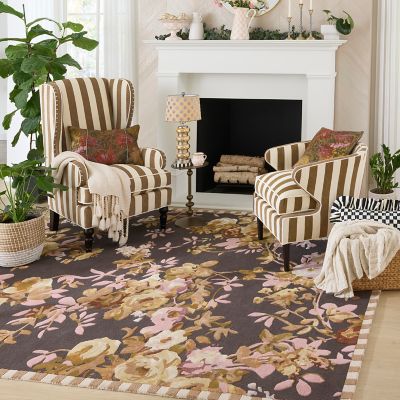 This wool-blend 8′ x 10′ rug captures the romance of wild roses, done in browns and pinks, with a border of checks that’s looped and sheared for added dimension.