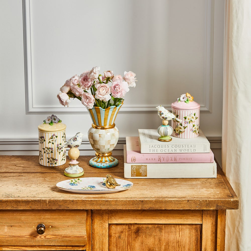 Our set of two Wildflowers Bird Topiaries will make your décor sing. These resin birds of two different heights feature our pretty Wildflowers pattern with touches of golden foil atop a finial accented with hand-painted patterns.