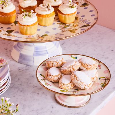 Our Blue Large Wildflowers Enamel Pedestal Platter is certain to be the center of attention at every gathering. The color-glazed serving dish is decorated with hand-applied floral transfers on a background of hand-painted blue splots atop a blue check base.