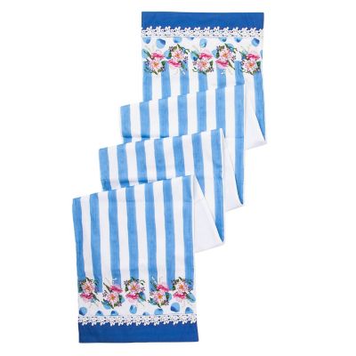 Top your spring table with a table runner featuring blue stripes, trimmed with our Wildflowers pattern. The reverse is white cotton fabric.