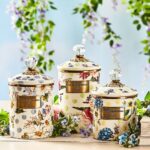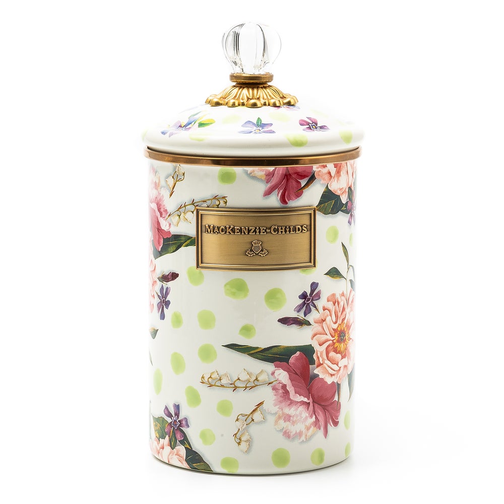 The Wildflowers Enamel Canisters hold just about everything. Keep them in the kitchen with baking staples or invent new uses around the house. Perfect for cotton balls in the bathroom, pens and pencils in the office, or knick-knacks and doodads in the kids’ room. Each canister is color-glazed and decorated with hand-applied floral transfers on hand-painted splots, topped with a clear glass knob. These canisters stand handsomely alone or harmonize delightfully in a multicolor Wildflowers set.